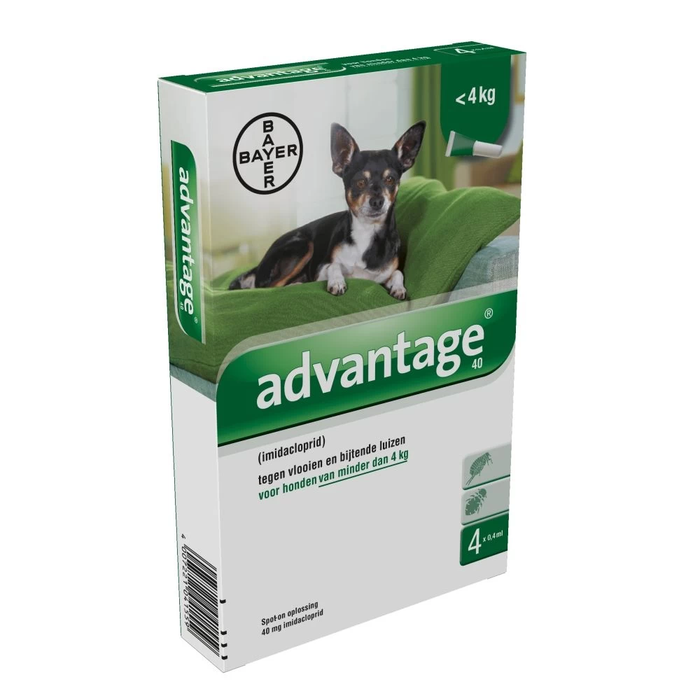 Advantage 40 hond is een spot on opdruppelvloeistof voor honden met een lichaamsgewicht tot 4 kilo. Het is een eenvoudig toe te dienen, snelwerkend middel voor de bestrijding en preventie van van vlooien, vlooienlarven en bijtende luizen. Na toediening worden aanwezige vlooien binnen één dag gedood en blijft het dier tot 4 weken beschermd tegen een verdere vlooienbesmetting. Advantage 40 blijft zelfs werkzaam wanneer het dier nat wordt, bijvoorbeeld na het zwemmen of na blootstelling aan hevige regen, tenzij het dier regelmatig zwemt of gewassen wordt. Gebruik het middel niet bij dieren met een bekende overgevoeligheid voor het werkzame bestanddeel of een van de hulpstoffen.