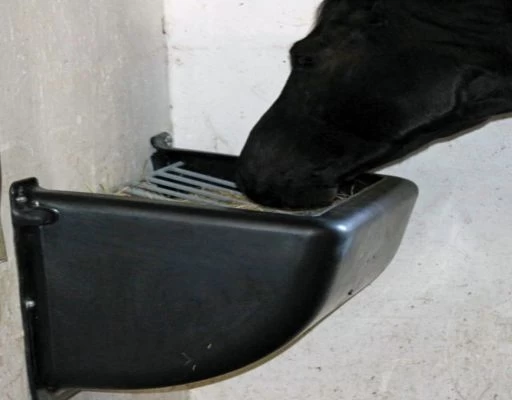 De vorm en de plaatsing van deze voederbak houden rekening met de natuurlijke eetpositie van een paard. Stof etc. zal via de brede gaten aan de onderkant verdwijnen waardoor een paard minder last zal hebben van zijn luchtwegen.