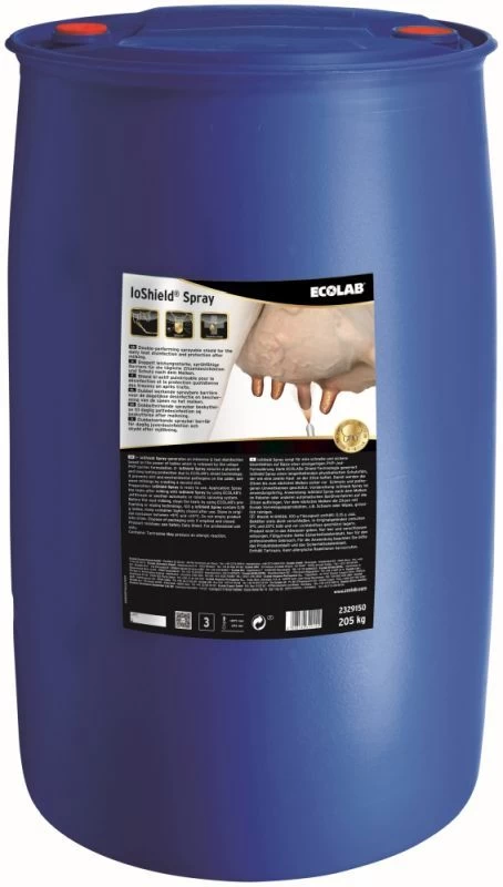 Ecolab IO Shield Spray is een effectief spraybaar barrièreproduct op basis van PVP jodium voor uierdesinfectie en -bescherming tussen de melkbeurten.
