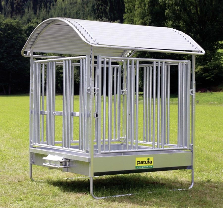 - Het voederhek heeft 12 voerplaatsen. Wordt standaard geleverd met een in hoogte verstelbaar dak en een opvangbak, stevige steunbeugels, 3-punts aankoppeling voor eenvoudige verplaatsing met trekker of wiellader.