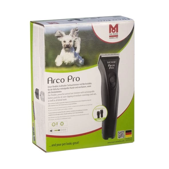 De Arco Pro tondeuse van het merk Moser, is een flexibele, krachtige dierentondeuse met verwisselbare accu voor fijn trimmen en het hele lichaam. De tondeuse is geschikt voor katten en (middel)grote honden.