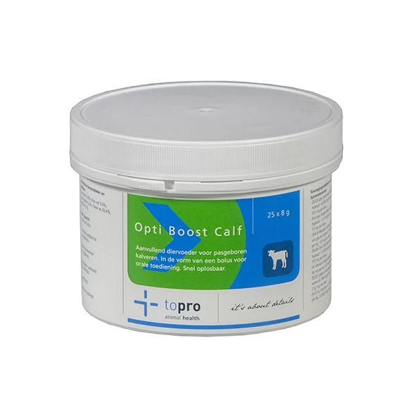 De Topro Opti Boost Calf bolus is een aanvullend diervoeder voor pasgeboren kalveren in de vorm van een bolus die het dier voorziet van dextrose, gist (geïnactiveerd), koolzaadolie en calciumstearaat.